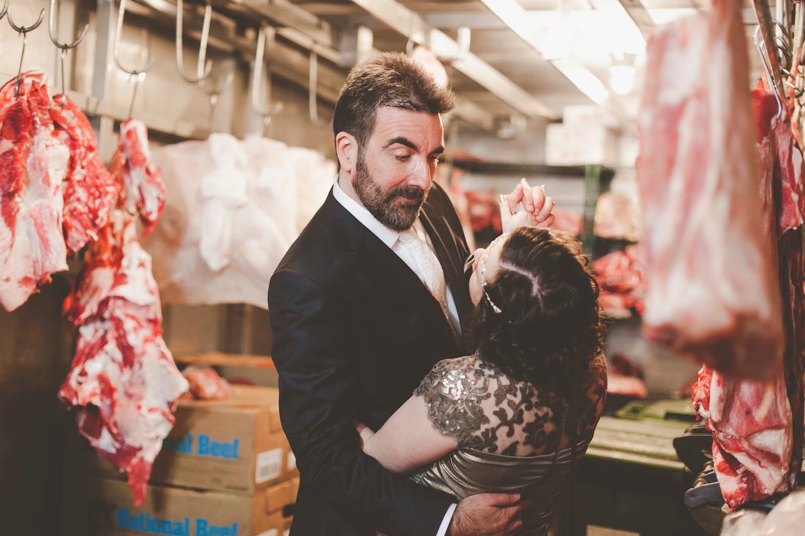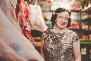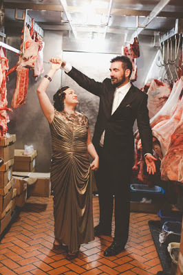 We picked the venue first because it was irresistibly lovely, but second for sentimental reasons: we had spent a year living just around the corner from it, in a tiny, perfect apartment on top of the Ellas Meat Market--itself, a very fine butcher shop on Pape just a few steps south of Danforth. We'd bonded well with the guys who ran Ellas, and also learned to appreciate well-marbled prime rib, properly-raised chicken, good bacon. But mostly, we bonded with those guys at Ellas. We charmed each other, and became like family. Enough like family that we connived our way into their spotless, gleaming meat locker for some wedding photos (by Kayleigh Shawn McCollum). Here are three of the best ones.