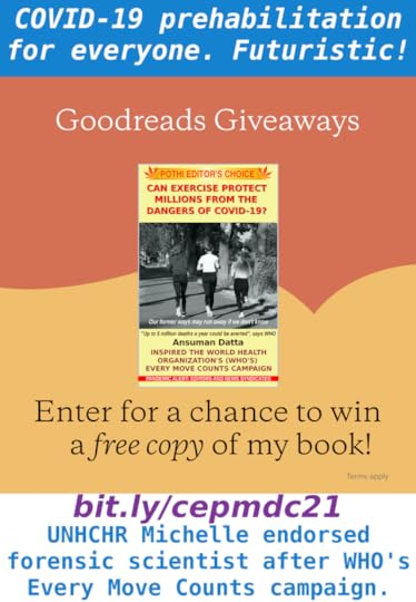LIVE NOW! UNHCHR Michelle endorsed me for COVID-19 following WHO's Every Move Counts campaign inspired by this eBook and relayed forward by the International Olympic Committee and Hadassah Women's Zionist Organization of America, inter alios. Your honest book reviews, suggestions or nominations will help others prehab for the pandemic. Please follow me to let your friends on Goodreads see the Giveaway in their feeds.
