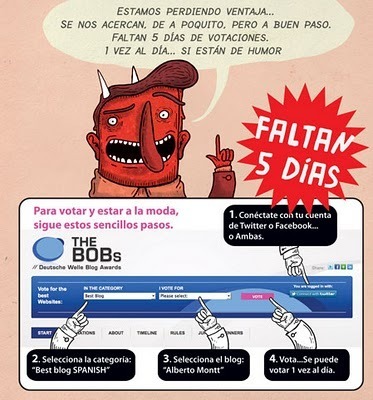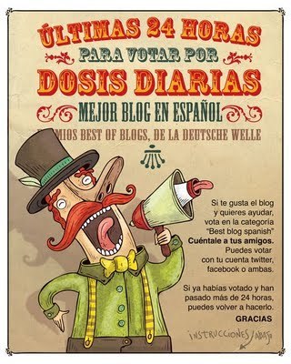 Las votaciones son hasta el 11 de abril y se puede votar una vez por día. y, si tienes ganas, una vez por facebook y una por twitter :D. Muchas gracias. Vota aquí.