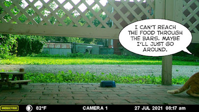 At one point, when Bart was whimpering, Jay came by to check out the situation. I had Bart's trap under the stoop, behind the iron gate. Jay couldn't get in, but he tripped the motion detector. I took a look outside the window, and there was Jay staring at me with the most accusatory glare.