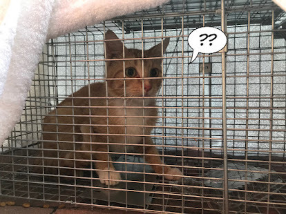 I had him in the trap all night, covered, fed, watered. He slept for a while, then he woke up and moped a bit (see "Saddest Cat on Earth" video 1), then around 4 a.m., he started in with the occasional mew.