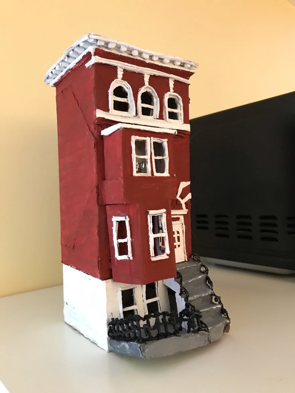 Look what Denise made me as a late birthday gift! (I was in Burbank in April.)This is incredible. There is a door under the stoop--that's to my little studio. There's a cat upstairs in the window. There is detail carved over the door and a pipe alongside the bay window.