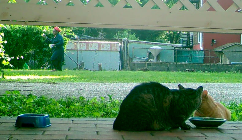 This morning I filled the catfood bowl, then sat inside and watched the ferals tackle their breakfast. And as I sat there, a nun in pajamas, bathrobe, and a hair-cap wandered out to pick up the hose and water the convent vegetable garden.