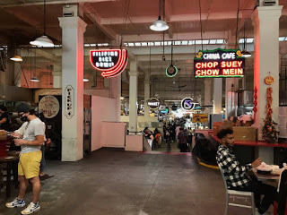I took the #155 bus to Universal for the metro Red Line, also called the B line now. I'll probably still call it the Red Line forever, the way old-timers in New York call the subway lines IRT or BMT. (You didn't think that was just a sandwich, did you?)The train was filthy. Almost all the passengers were men, with a couple of raggedy sleeping men on each car. I wondered briefly if this might not be my best idea ever, but the doors closed and we were off to Hollywood. I disembarked at Hollywood and Western, walking alone through the station. A colorful sign at the top of the escalator advertised a bi-weekly farmers market. I crossed Hollywood Boulevard, expertly dodging a ranting man at a bus stop. I trekked up the block to Thai Town, had some pad thai at a tiny outdoors table. I was relieved the little carry-out I like had made it through the pandemic. Unfortunately, my favorite Thai massage place was closed. There's no way to know for now if it's closed forever. I only found one open, and there were no appointments for the next two hours. No Thai massage for Marie today!