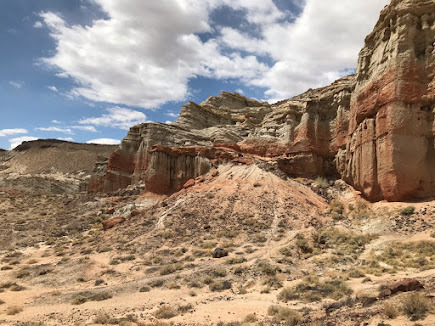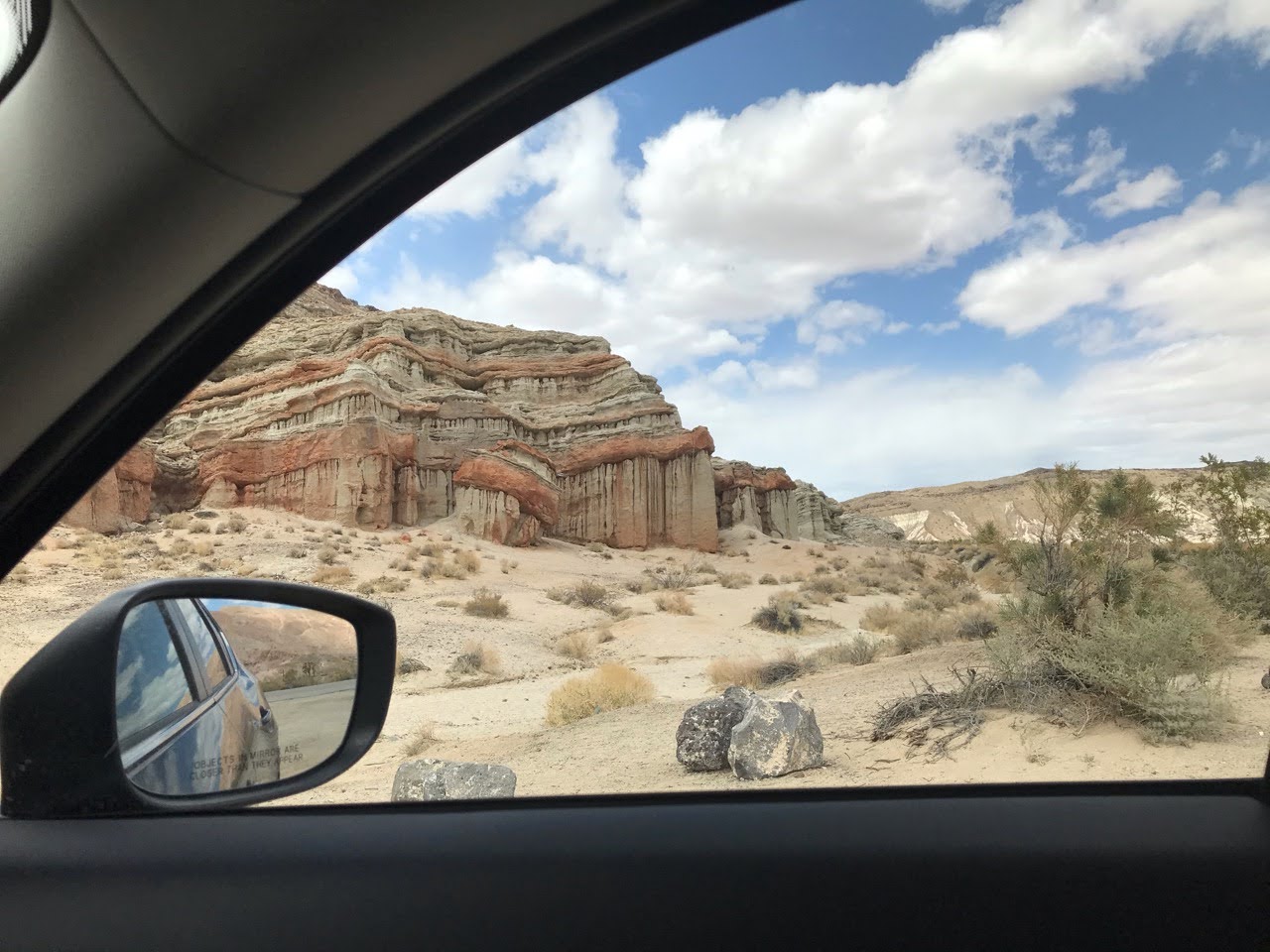 Then today I rented a little car. I got a Mazda this time. I went out to the desert, out past the wind farms, out past the FM band, to look up at red cliffs. I walked a state park trail, then drove through the campground loop, where people set up tents and campers in the shadows of buttes. I envy them their relaxation in nature.