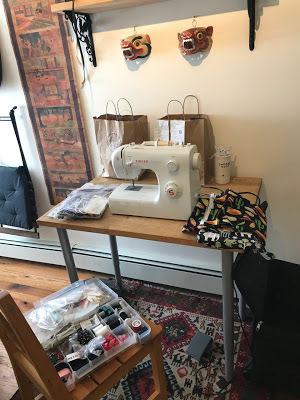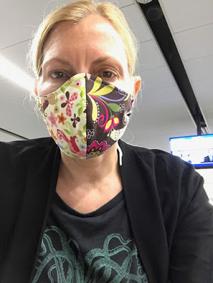 I headed home from the airport, put on my disposable gloves, got a takeout coffee at The Grind and an egg-in-a-wrap from Martha's, took them home to dump into my own dishes, scrubbed my hands carefully, and had breakfast in my own home.ShopRite miraculously opened up delivery slots, so I got as many groceries as fit in my half-size fridge. They even had Lysol wipes, which I hadn't seen since early March. I stopped by the dollar store--they had hair wraps, the right kind for maskmaking, and I pulled out my cheapie sewing machine I hadn't touched since I moved to Los Angeles.