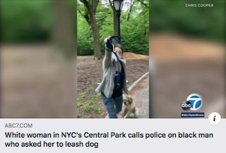 I would NOT have anticipated that early yesterday morning, an angry middle-aged woman of some apparent privilege, a white woman investment banker with all the clichés that description carries, would go on a hysterical rant at Chris when he asked her to leash her dog in a migratory bird habitat in Central Park. She got up in his face, she called 9-1-1 and made a false report claiming she was being menaced by "an African American man," ramping up her hysteria while also nearly choking her cocker spaniel.