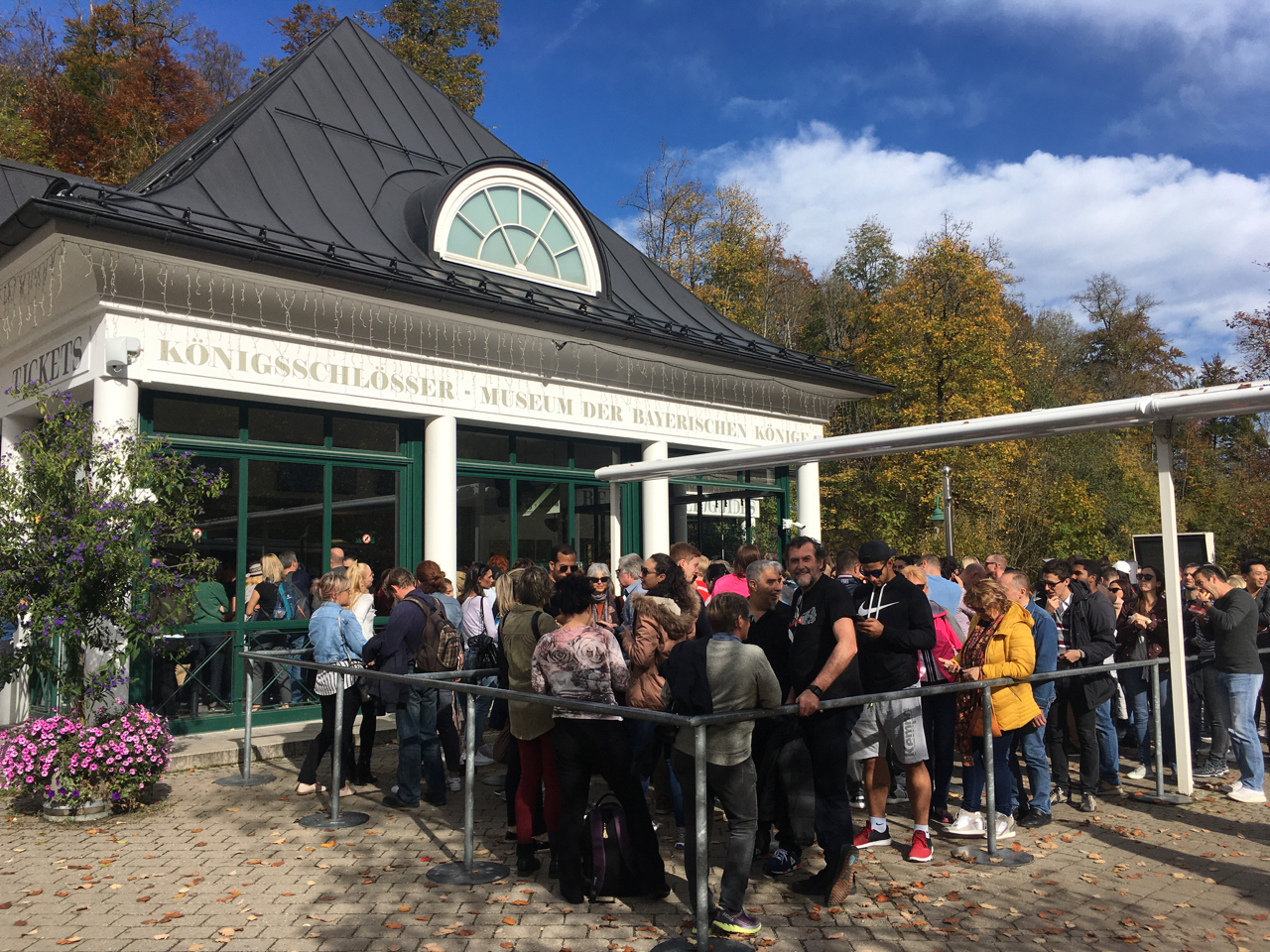 Once off the bus, we all rushed up the hill to the ticket center. There are signs telling you where to go once you're off the bus. We all lined up and waited for the 8:30 opening, then surged in through the winding queue, like when you're at an airport or Disney World. I was in maybe the third row from the front, and people with reserved tickets had their special own queue. I glared at them with jealousy.A screen indicated availability and I watched as each slot evaporated. Tours start at 10, and I figured I'd get close to that and be on the 12:05 train back to Munich, latest. But no. By the time I'd gotten to the counter, the earliest I could get was a 10:55 audio tour. (You're not allowed in the castle on your own.)
