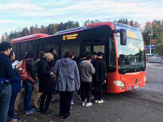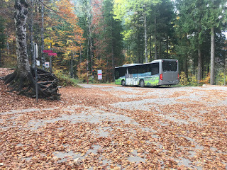 I'd used the Deutsche Bahn app to get a mobile phone Bayern Ticket for the day. These are 25 euros and go from almost midnight to midnight on weekends. They work on the local trains, commuter trains, and the buses, so this covered my trains to and from as well as the buses on the Neuschwanstein end of things. I was on the 5:52 a.m. train to Füssen—the first direct train of the day—which arrived at 7:55. That worked for me, since the ticket office opens at 8:30 in the "off-season."The train seems to be carrying straggling partiers from the night before, me, and a bunch of young Korean tourists. By the time it got to Füssen, the partiers had all disembarked.