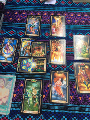 I walked once around the arena, and then dove into the offshoot, the real "flea-like" part. This is exhausting, though, so eventually I spotted a good and restful distraction, and sat down at the tarot card reader's booth. For ten bucks, I got some pleasant conversation and hearty entertainment. I've had my palm read, my cards read, gone to psychics, and had my chart done. I've even had a reading over Skype. I enjoy all of these things immensely, especially when the reader seems to be tailoring the reading to me. Today's reading was extra-fun, because the reader pinned me as working for money right now and seeing a choice down the road between doing so and escaping for the creative. I'd say IT'S LIKE SHE KNEW ME, except isn't this everyone's dream?
