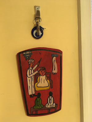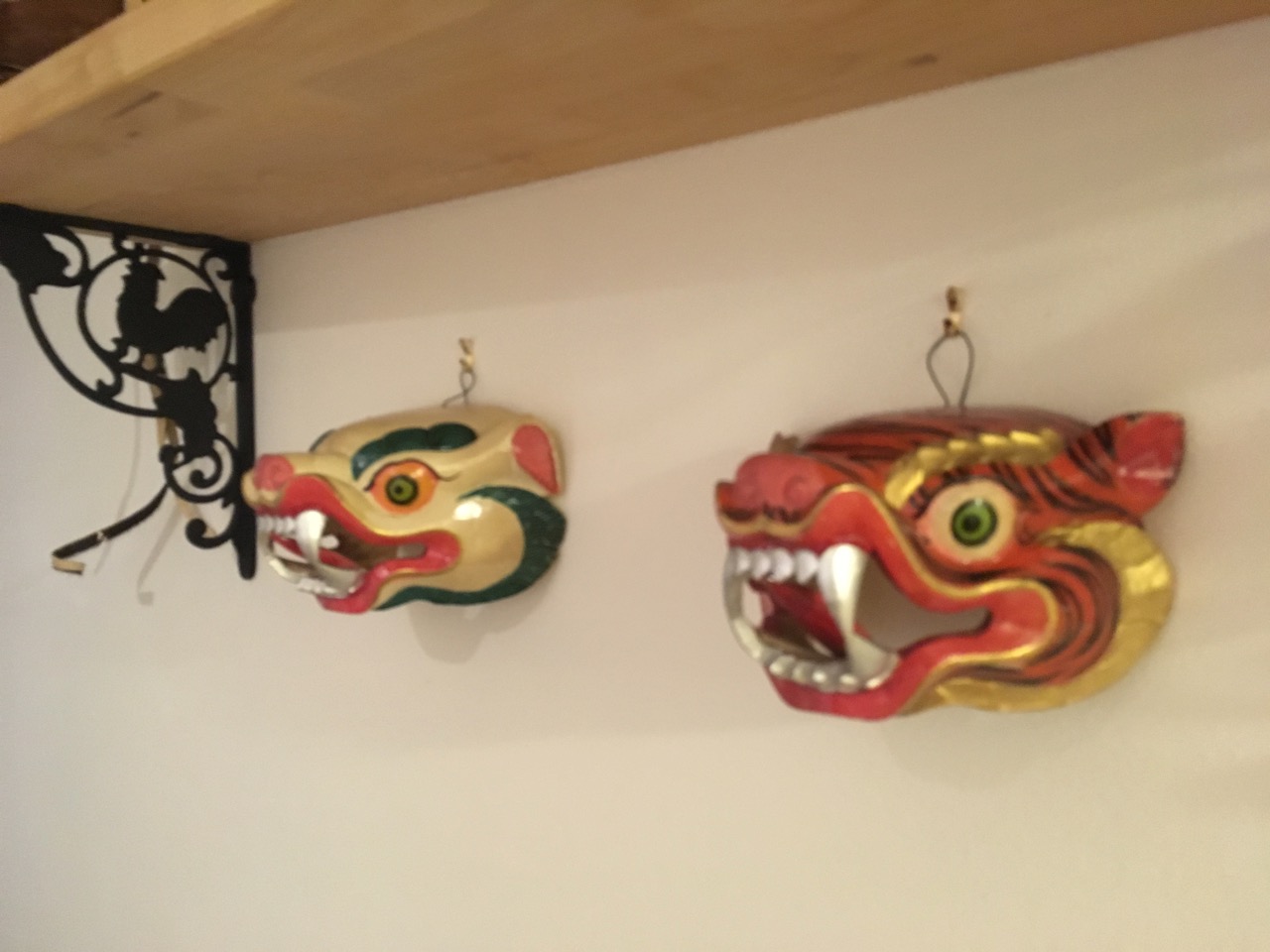 I hung some souvenirs over the weekend, including some things I'd been struggling to figure out how to display. I don't have a great photo of the Polynesian ceremonial war paddle, but it's finally up. You can see one side of it in the top photo.