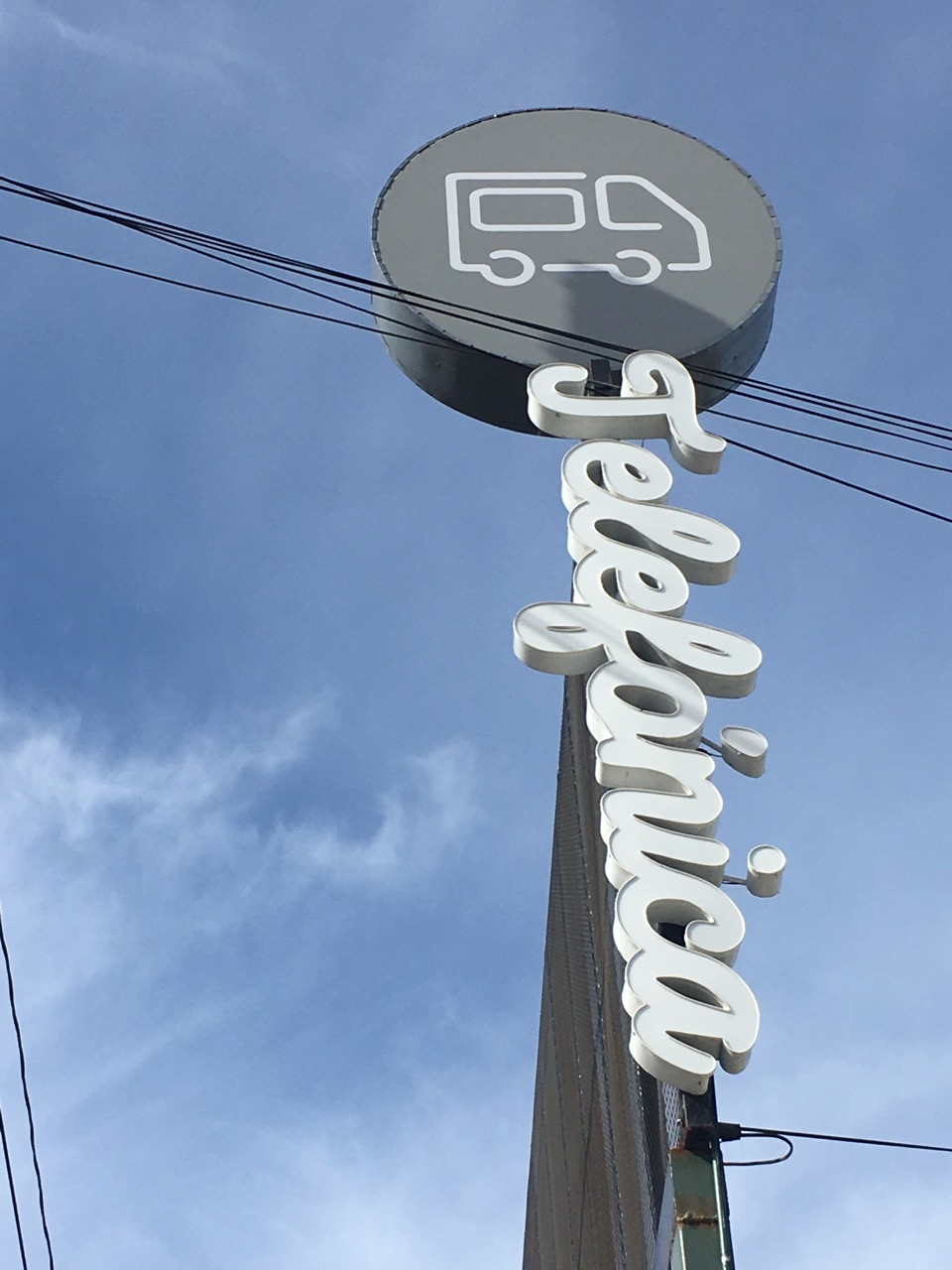 Then one day in late November, I was wandering around the far reaches of DTLA, in the Arts District, and I stumbled over a converted warehouse with a bunch of food trucks. Oh, yay, more food trucks. (That's sarcasm. We get three food trucks a day, five days a week at my place of employment.)