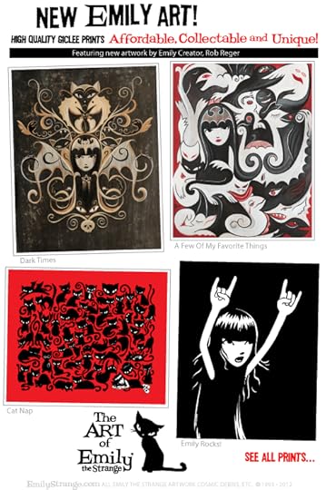 NEW Emily the Strange Art Prints!Featuring new artwork by Emily Creator, Rob Reger:Dark TimesA Few Of My Favorite ThingsCat NapWizard of OddTrinityand other visual treasures......like fav classics:Cruisin' For A Bruisin'Emily Rockin'and the popular recent Design Of The Week, Kitty House!