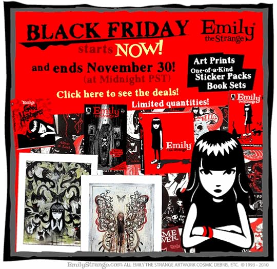 Black Friday Starts NOW on EmilyStrange.com!and ends November 30! (at midnight PST)Very limited quantities of Strange Goodies & Rarities available now...LOTS of one-of-a-kind Sticker Packs and Book Sets!!Deals on all Art Prints too!