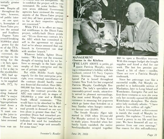 So, having drawn on Investor’s Reader for my two previous books about women in business — POPOVERS AND CANDLELIGHT, about restaurateur Patricia Murphy, and SCAN ARTIST — about speed-reading marketer Evelyn Wood — I went to the New York Public Library to consult the year-end lists of Investor’s Reader articles. I began with the 1940s because I’m interested in that decade, and I skimmed each December list of the decade for women’s first names.