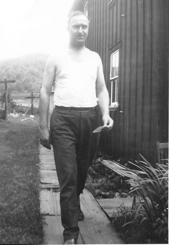 Denise Cuneo’s grandfather, John DeCarli, on a wooden sidewalk in Byrnedale in 1945. He was one of the 350 coal miners who struck for sanitation and the right to own their own homes.