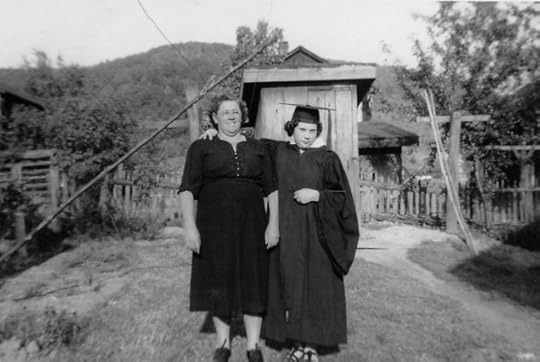 Denise’s mother, Dolores “Lulie” DeCarli, and her mother Mary pose before the outhouse in their yard. It’s high school graduation day.