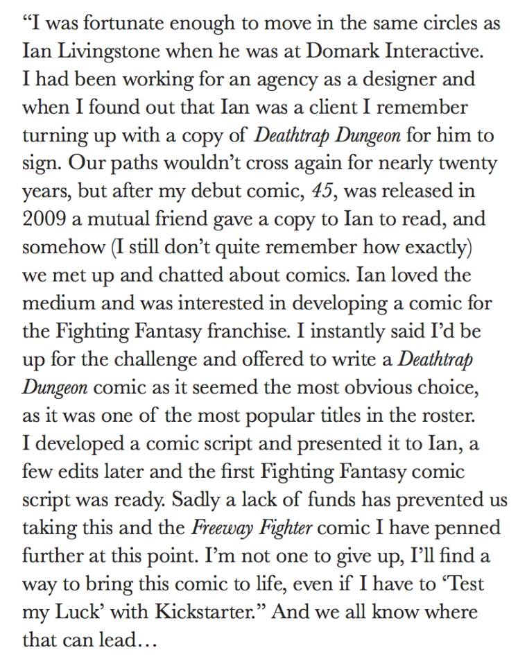 Although I dotted a few 'i's and crossed a few 't's here and there, FREEWAY FIGHTER the comic is really Andi Ewington's baby, and I thank him wholeheartedly for inviting me to join this project. A huge thank you must also go to Matt Mastracci, who has financed the project, and what makes him involvement all the more special to me is that he came on board after reading this passage in YOU ARE THE HERO!