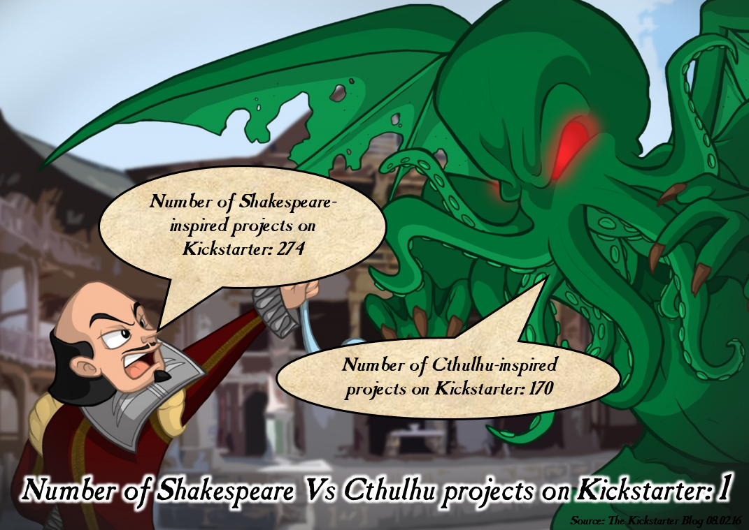 Shakespeare Vs Cthulhu has featured on Kickstarter's 'The First 100,000 Funded Kickstarter Projects in 100 Numbers' blog post. Check out #73-#75 on the list: