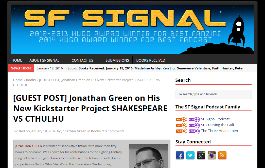 The very kind people over at SF Signal allowed me to write a piece about the Shakespeare Vs Cthulhu Kickstarter and you can read it for yourself here.