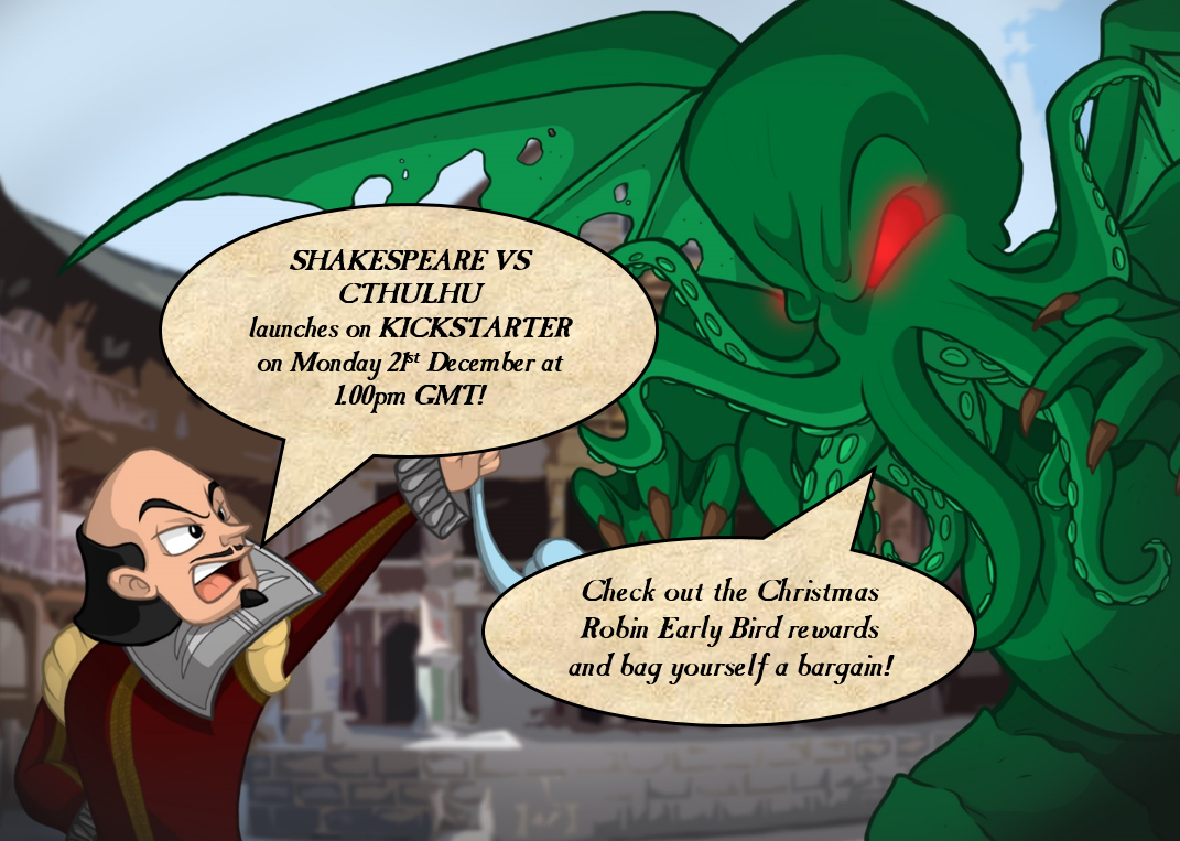 Launching today, Monday 21st December 2015, at 1.00pm GMT is Shakespeare Vs Cthulhu .Imagine if it had been William Shakespeare, England’s greatest playwright, who had discovered the truth about the Great Old Ones and the cosmic entity we know as Cthulhu, rather than the American author H P Lovecraft.Imagine if Stratford’s favourite son had been the one to learn of the dangers of seeking after forbidden knowledge and of the war waged between the Elder Gods in the Outer Darkness, and had passed on that message, to those with the eyes to see it, through his plays and poetry.Welcome to the world of Shakespearean Cthulhu!You can find out more about the project here, and check out the Christmas Robin Early Bird backer rewards in particular. Get in there fast and you could grab yourself a bargain!