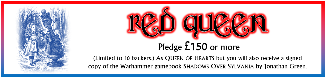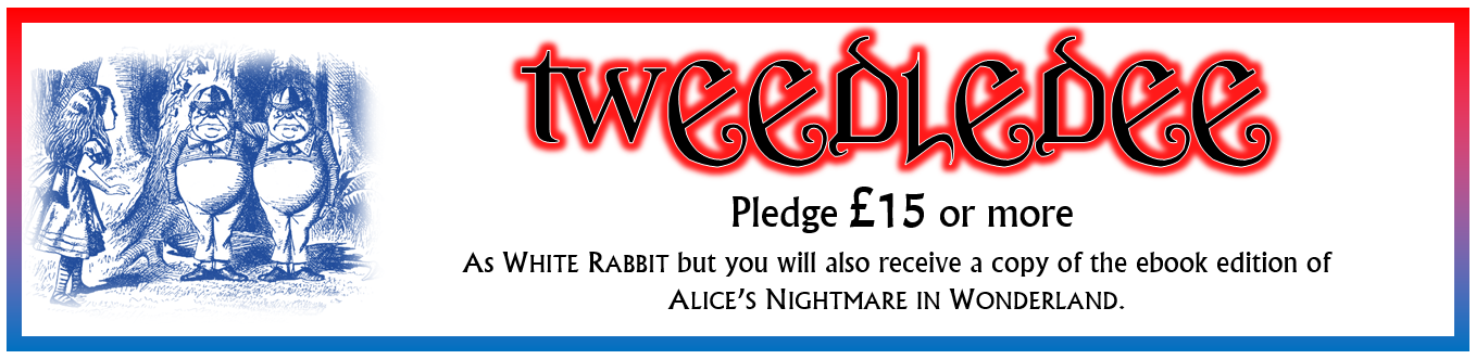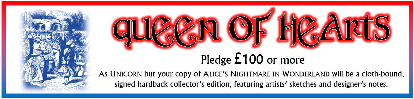 How can you help make this happen? You might want to consider increasing your pledge, for a start. If you backed to receive a MARCH HARE paperback, why not make it a limited edition CHESHIRE CAT hardback? If you've already gone for the hardback option, why not make sure your name appears in the Acknowledges for all posterity, by upgrading to the GRYPHON level pledge?