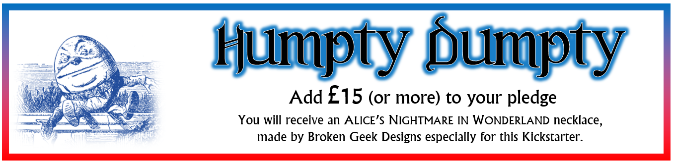 If you would like an Alice's Nightmare in Wonderland necklace, made especially for this Kickstarter by Broken Geek Designs, simply add £15 to your current pledge for every necklace you would like to purchase - necklaces rather like these...