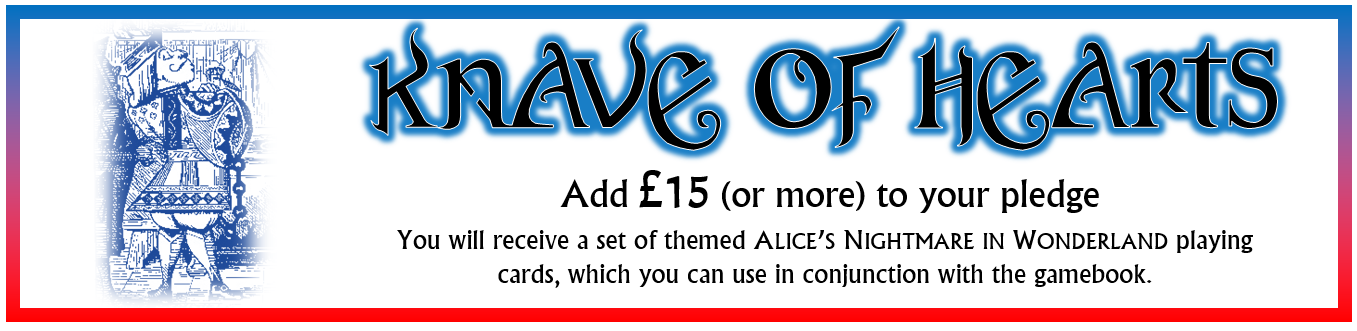 Alice's Nightmare in Wonderland has been conceived as a standalone gamebook. Just because this book has funded I am not going to commit to writing a second one, straight off the bat. And I don't want to promise extra rewards which it then becomes impossible to deliver, as the budget becomes squeezed more and more. (This has been a common problem with many Kickstarter projects.) I also don't want to do anything that's going to delay publication of the gamebook. (Been there, done that!)