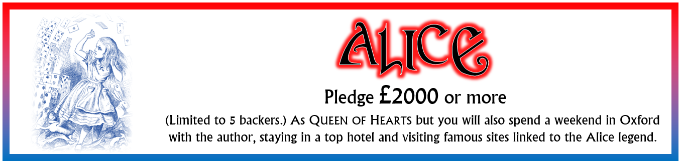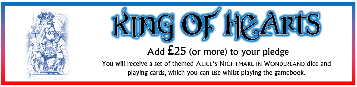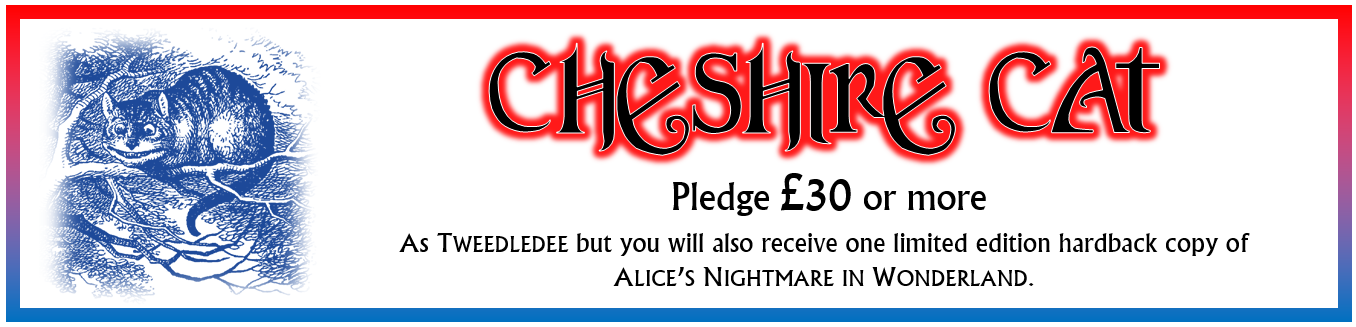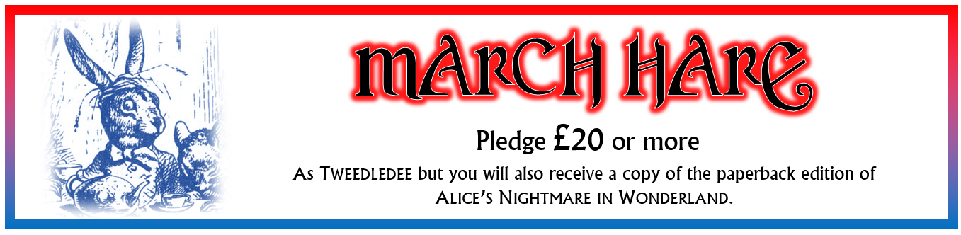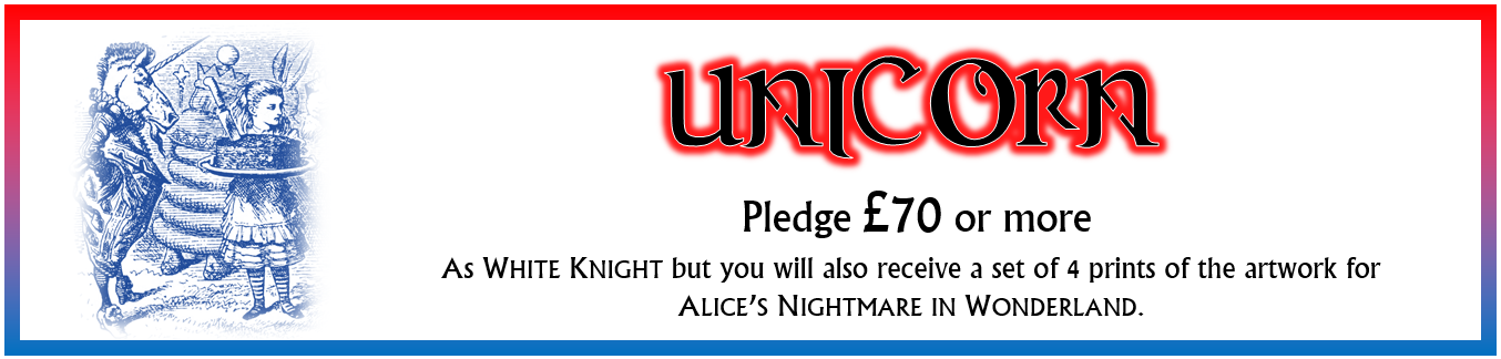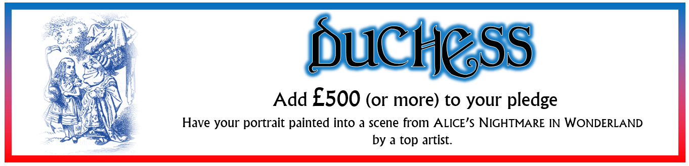 Experience tells me that some people won't back a project until they know it's actually going to happen, so now that we've passed funding I expect that we will pick up some more people before the end. There are still 8 days to go until the project closes at 1.00pm BST on Monday 3rd August, so keep spreading the word and let all your friends know that Alice's Nightmare in Wonderland is happening!