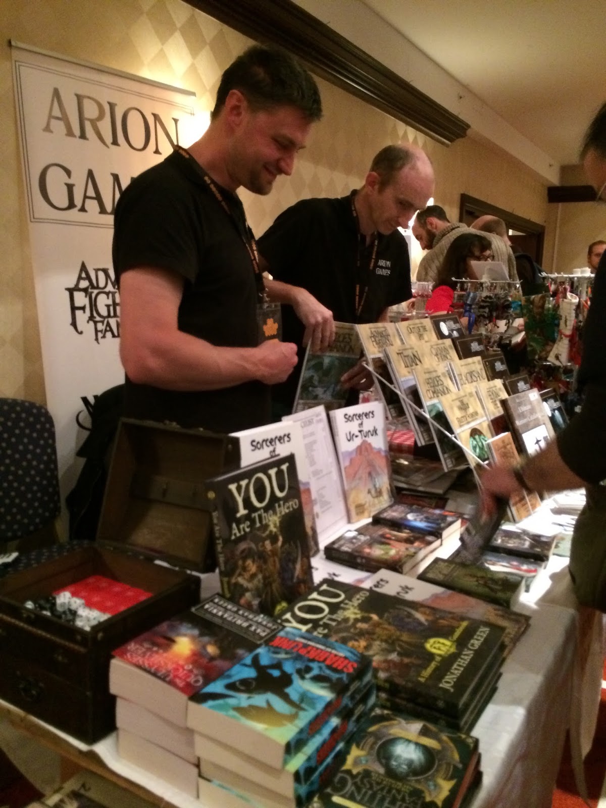 Graham Bottley and Simon Strafford on the Arion Games stand.Despite being stuck behind a table for most of the weekend (and so not getting to see much else that was going on) I had a great time, with people stopping by to pick up YOU ARE THE HERO (some of whom had seen it mentioned in the programme), backers of the original Kickstarter stopping by to get their copies signed or to pass on their very kind comments about the book, and old friends turning up just to say hello (people like Jim Swallow, James Wallis, and Matt Elliott). On Saturday night I recorded a podcast for Pod Your Own Adventure (but more on that another time), and then on Sunday afternoon this happened...
