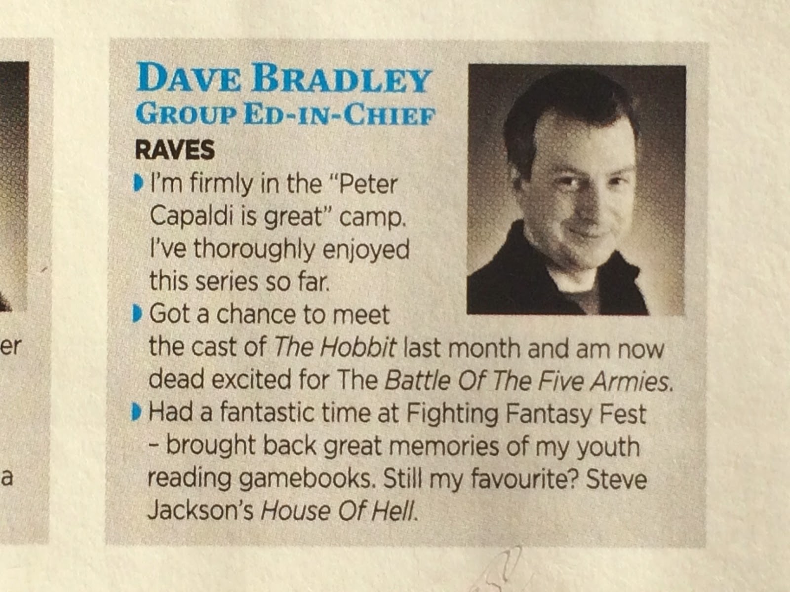 However, I had no idea that friend of Fighting Fantasy, and this blog, Group Editor-in-Chief Dave Bradley, would have this on his bio bit this month...