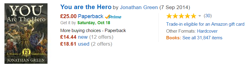 I have two books out which would make ideal Christmas presents. One is YOU ARE THE HERO - A History of Fighting Fantasy Gamebooks , which now has 28 five-star reviews on Amazon, and which was also recently reviewed by the Fantasy Book Review, scoring 99%!