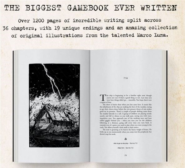 Leaving aside the 'innovative non-linear structure', this second bold (and factually inaccurate) claim was challenged when one of the Alba team posted a link to the Kickstarter on the Fighting Fantasy (and other gamebooks) Facebook group. From the discussion that subsequently took place it seems that the book is roughly 165,000 words long and has 800-900 sections.