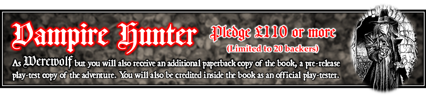 These include the VAMPIRE HUNTER level reward, which is limited to 20 backers, and which comes with a pre-release play-test copy of Dracula - Curse of the Vampire , and an official play-tester credit.