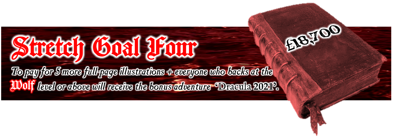 And if we hit Stretch Goal #4, as well as the book having 20 full-page illustrations, everyone who backs at the £10 Wolf level and above will also receive an entire bonus adventure called Dracula 2021 .
