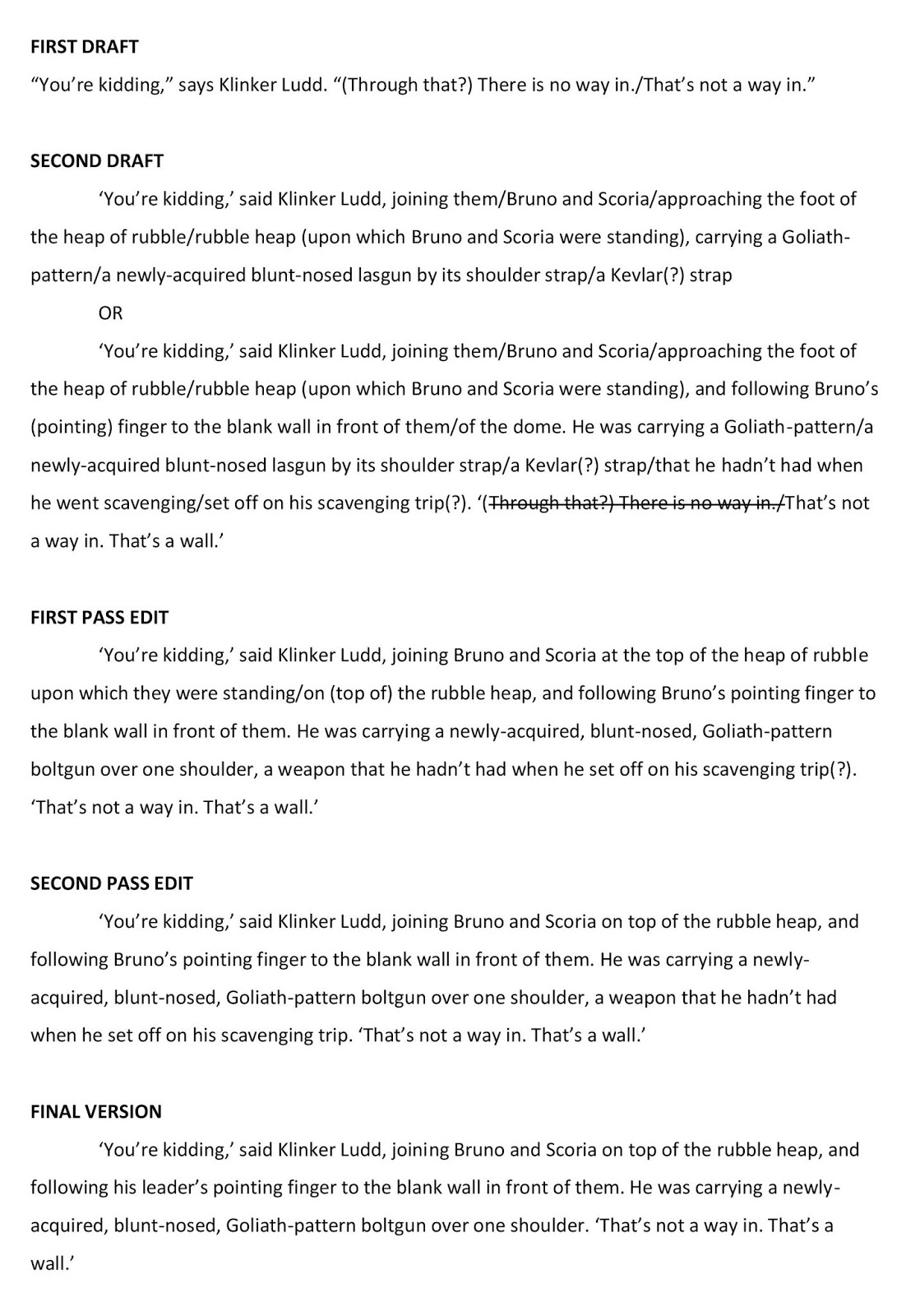 Take, for example, the short story I completed today. It was commissioned to be 8,000 words long. The first draft ran to 12,000, but once I had finished editing it, it was just over 8,000. This is because I am very indecisive and my first draft is full of all the alternative ways of phrasing things that I could use, and which I don't finally decide upon until the final edit. My first drafts are also littered with notes, and prompts, and even ideas for other stories, which don't get taken out until the edit.