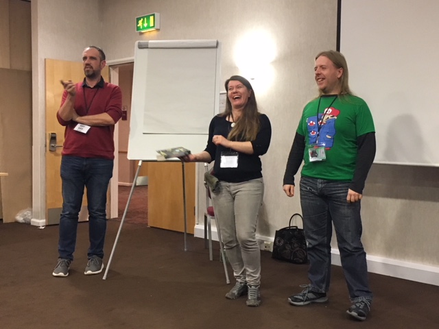 Mark Norman, Tracey Norman and Sam Burns of Circle of Spears attempt to keep a straight face during the Night of the Necromancer read-through... and fail!So all that there remains for me to do now is to thank Gary, Julie, Chris, Dave the Tech Gnome, and the rest of the crew, as well as everyone who attended my talks and the Fighting Fantasy read-through. And if you're a author looking for a welcoming audience, I can wholeheartedly recommend ArmadaCon.