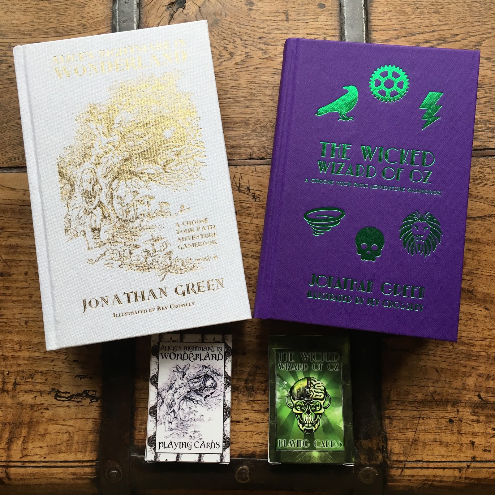 , written by Jonathan Green and illustrated by Kev Crossley.DETAILS: Jonathan will sign and personalise a hardback copy of each of the choose your path adventure gamebooks Alice’s Nightmare in Wonderland and The Wicked Wizard of Oz , dedicated to you or the person of your choice. You will also receive one set of collectible Alice’s Nightmare in Wonderland playing cards and a set of The Wicked Wizard of Oz playing cards.