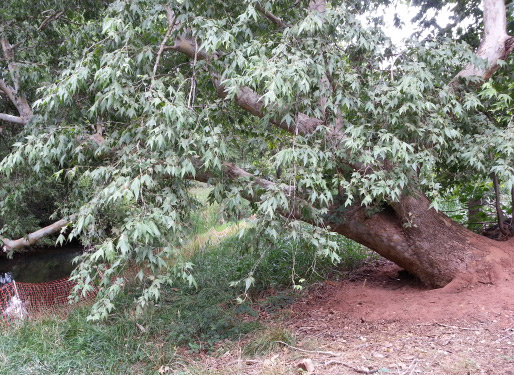 The second problem is what she’s been using as her hair scraper. Back in the corner of the property there is an old Sycamore. It has a massive trunk and a thick branch that juts out over Oak Creek. Being a Sycamore, the trunk is very smooth. More importantly, time has encouraged it to lean toward the creek, creating the perfect place for a moderately-sized ewe (Tiny has long since outgrown her name) to use when rubbing her back.