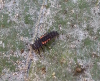 That’s when I pulled out my big guns. I covered the stair rails, the leaves, and the ground around the plant with diatomaceous earth. Of course, it immediately rained and washed away much of that fine powder, so I started round two. While I was spreading it the second time, I turned over a leaf. Standing tall on their delicate stems was a line of green lacewing eggs. I quickly flipped over another leaf and found tiny ladybug larvae. On yet another leaf was a clutch of golden Assassin bug eggs. Reinforcements have arrived!