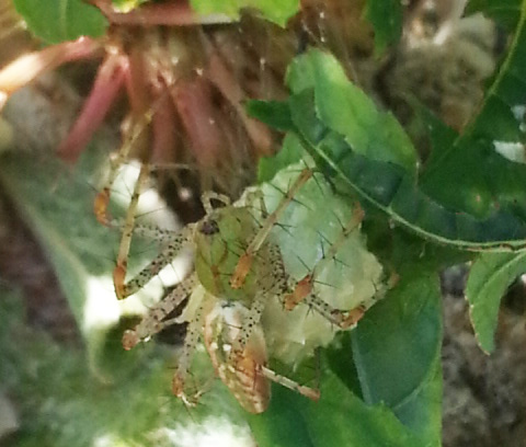 The moment I saw her, I knew I had to have a picture. I have a feeling she may be one of a kind. When I went back the next day with my phone, I discovered her previous big round abdomen had given way to an egg sack just about the same size. Looking much slimmer now, she spends her day crouched on top of the massive sack. As I turned the leaf trying to catch a photo, she moved with the plant, trying to protect her children from me. Because she doesn’t have a web, at least that I can see, I’m guessing she’s not a web spinner, but a free hunting spider. But I really don’t know that.