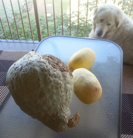 This year, I grew Hubbard squash, which as you can see from the picture (those are two very nice sized spaghetti squash with it), are huge, roundish, warty squash with a blue-green skin. Or, rather, I am still growing Hubbard squash. My goodness, but it’s prolific! I may not have had zucchini to give away, but after processing three 25 pound Hubbards, I gave away three more with probably 3 more to harvest (I think I see them peeking out of the leaves in the garden).
