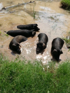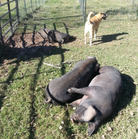 With all my gates secured, I make my way back to the house, feed the dogs, drink a pot of tea and eat breakfast. By the time I’ve finished eating, the pigs are eager to get to the back pasture. They adore that space. Lots of tall trees, plenty of soft dirt, a nice mud wallow, and a dribbling snout-sized irrigation pipe.