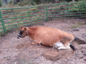 When I still didn’t have a calf by Thursday, I got worried, especially when June’s nose felt unusually warm. Was the calf dead? Many thanks to Phil, the ranch manager at Tres Hermanas. He came over, checked June, then checked the calf. If you don’t know how that’s done, it requires inserting your arm up to the armpit inside the cow. He said when he pushed on the calf, the calf pushed back. Whew. Not dead. But then, why is she waiting?