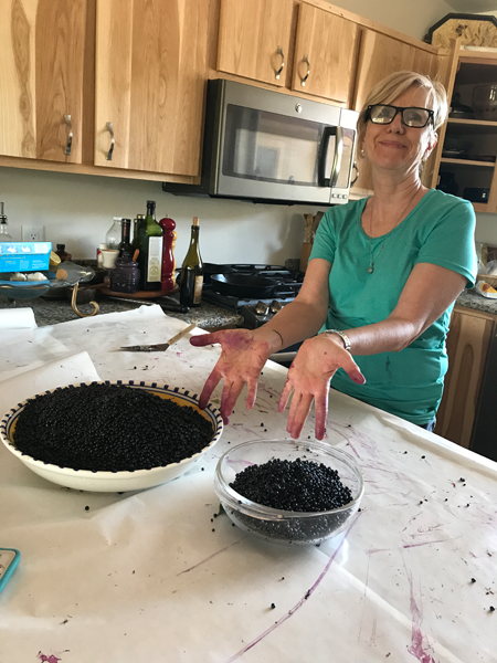 Laurie and the berriesWe filled a paper grocery bag with berries in less than half an hour, surprising me. She sampled sorrel for the first time, surprising her. Did I mention I threw French sorrel seeds on that hillside too? It’s actually outperforming the fennel that I threw out at the same time, and it grows really well under the native walnut tree, always a plus. What do I do with all the sorrel? I watch it grow and work on the next chapter.