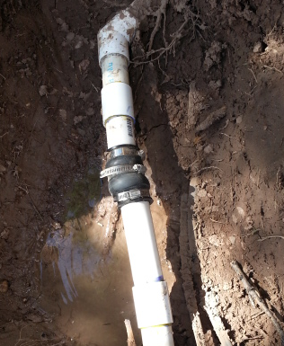 It didn’t make five minutes before the pressure in the pipe had water squirting everywhere. Now it was Al’s turn. He took my insert piece, cut it in half, coupled/glued the two pieces to the existing pipe ends. They fit so the two cut ends butted together. After that, he powered on the rubber coupling to hold those two ends together. After screwing it in place, we turned all the equipment back on and…Voila! It held. It bulged but it held. Just in case, Al added another hose clamp to the center of the coupling. And once again we congratulated ourselves on a job well done.