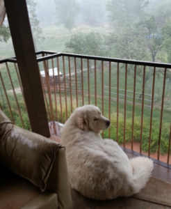 This is not Moosie’s favorite time of year. It didn’t always bother him. I remember two years ago sitting on the porch watching the lightning and the rain with Moosie quietly by my side.