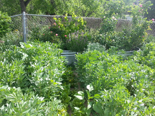 Favas with freckled lettuce in betweenRight now I’m harvesting a lot of lettuce, which Miss Piggy and the ravening woolly horde eat because I have so much. Except for the freckled lettuce seed given to me by a friend, those were more old seeds I didn’t expect to germinate. Surprise! And the fava beans that I’ve been propagating for four years are setting on like crazy. Favas appear to love it here because these guys have lost none of their vigor and everywhere I plant them they definitely improve the soil. I love these beans, but they’re a little labor-intensive to prepare. First, strip the beans from their pod, then blanch the loose beans for a minute in boiling water. After that, stand hunched over the kitchen sink, painstakingly squeezing every single bean out of its tough outer skin…