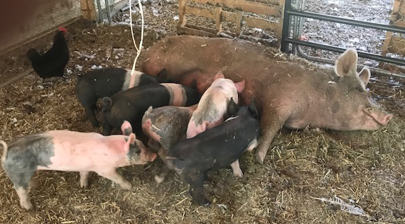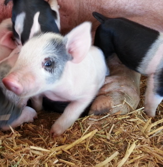 first 2 pigletsShe did it. On Tuesday night at 10:41 PM, Miss Piggy delivered the first of her eight babies. The firstborn piglet was small, black with a vivid white stripe around her middle and hit the straw, broke her enclosing sac then gave a massive squeaky gasp. She immediately wriggled her way around her mother’s back feet, past her teats to Miss Piggy’s snout where she crawled over her mother’s nose and worked her way down to the teats. #1 wasn’t as clever as the others because it took her an hour and a half and the birth of #2 before she figured out teats and sucking.
