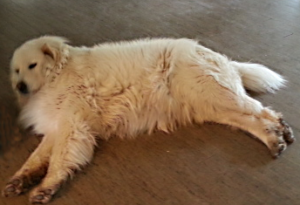 Bear in his Kuvasz glory!My next announcement is that Bear will be getting his summer cut tomorrow. What a relief for both of us! Although he is in his full Kuvasz glory at the moment, I swear that’s about forty pounds of fur which collects at least twenty pounds of dirt every time he steps outside the door. Where does that dirt end up? On the floor in my house, because the house is cool and he’s not.
